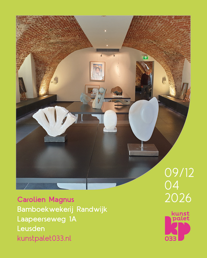 Tijdens de tweede editie van de kunstroute Kunstpalet033 doen meer dan 200 kunstenaars mee op ruim 60 locaties in Amersfoort, Leusden, Hoevelaken, Achterveld en Baarn. Mijn werk is te zien op de Bamboekwekerij Randwijk in het buitengebied van Leusden.